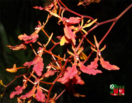 màu đỏ đậm, cánh tràng bên màu vàng có đốm đỏ. Cánh đài bên màu