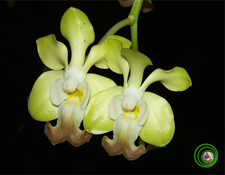 Hoa màu vàng chanh hay gần trắng ở mặt ngoài, cánh môi chia 3