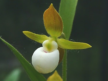 Môi trắng, hình cầu, ở phần chân màu vàng, bên trong có những đốm màu nâu. Ra hoa vào giữa mùa xuân đến giữa mùa hè.