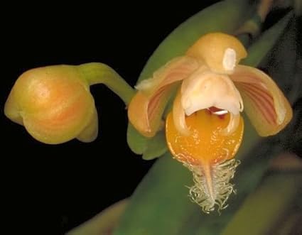 Mô tả: Lan sống phụ sinh, thân mảnh, dài 30cm, nhiều rễ chống. Lá hai dãy, dày, dạng thuôn tù, đỉnh chia 2 thùy không đều, màu xanh có ít chấm đỏ, dài 2 - 3cm, rộng 1,2cm. Cụm hoa ở nách lá, dài 1 - 2cm. Hoa nhỏ, 1 - 2 chiếc, cánh hoa màu vàng có vạch đỏ. Cánh môi màu trắng nhạt, chia 3 thùy. Thùy giữa nhọn, nạc, đỉnh có thùy dài dạng lông chim.