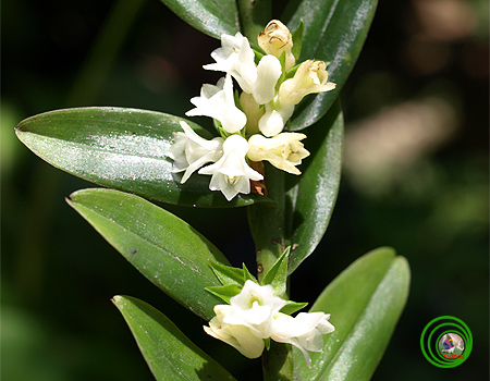 Mô tả :Loài lan đất, hay sống phụ sinh sinh mọc thành bụi, cao 60cm, không phân nhánh. Lá dạng thuôn tròn, xếp 2 dãy đều đặn, đầu có 2 thùy không đều nhau, gốc lá làm thành đốt. Cụm hoa dạng chùm ngắn mọc ở nách lá phía đỉnh, có 6 - 8 hoa. Hoa nhỏ màu trắng, với hai cánh đài bên đính thành một túi (móng) to, ngắn. môi nguyên, đỉnh có u nhỏ.